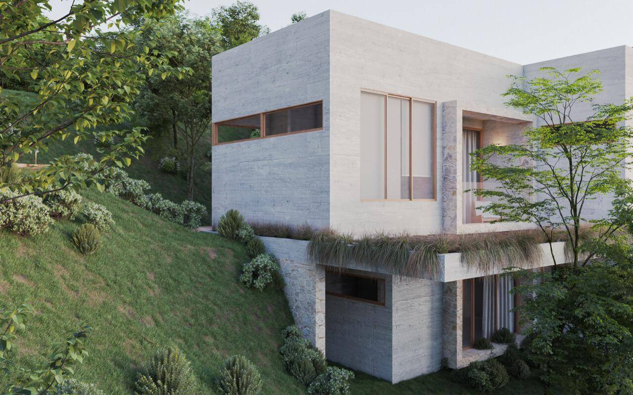 Alinhado ao novo platô na topografia do terreno, o pavimento inferior abriga a área íntima e social da casa, que se enraíza ao jardim externo através de grandes portas envidraçadas transformando a parte social num extenso terraço contemplativo. O telhado do pavimento inferior é usado como base para o mirante do pavimento térreo, com cobertura verde auxiliando nas condicionantes térmicas.