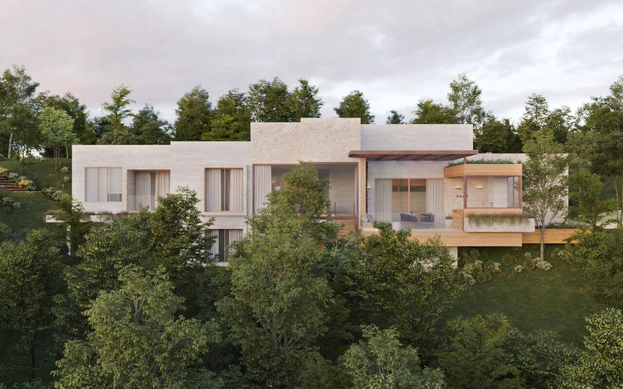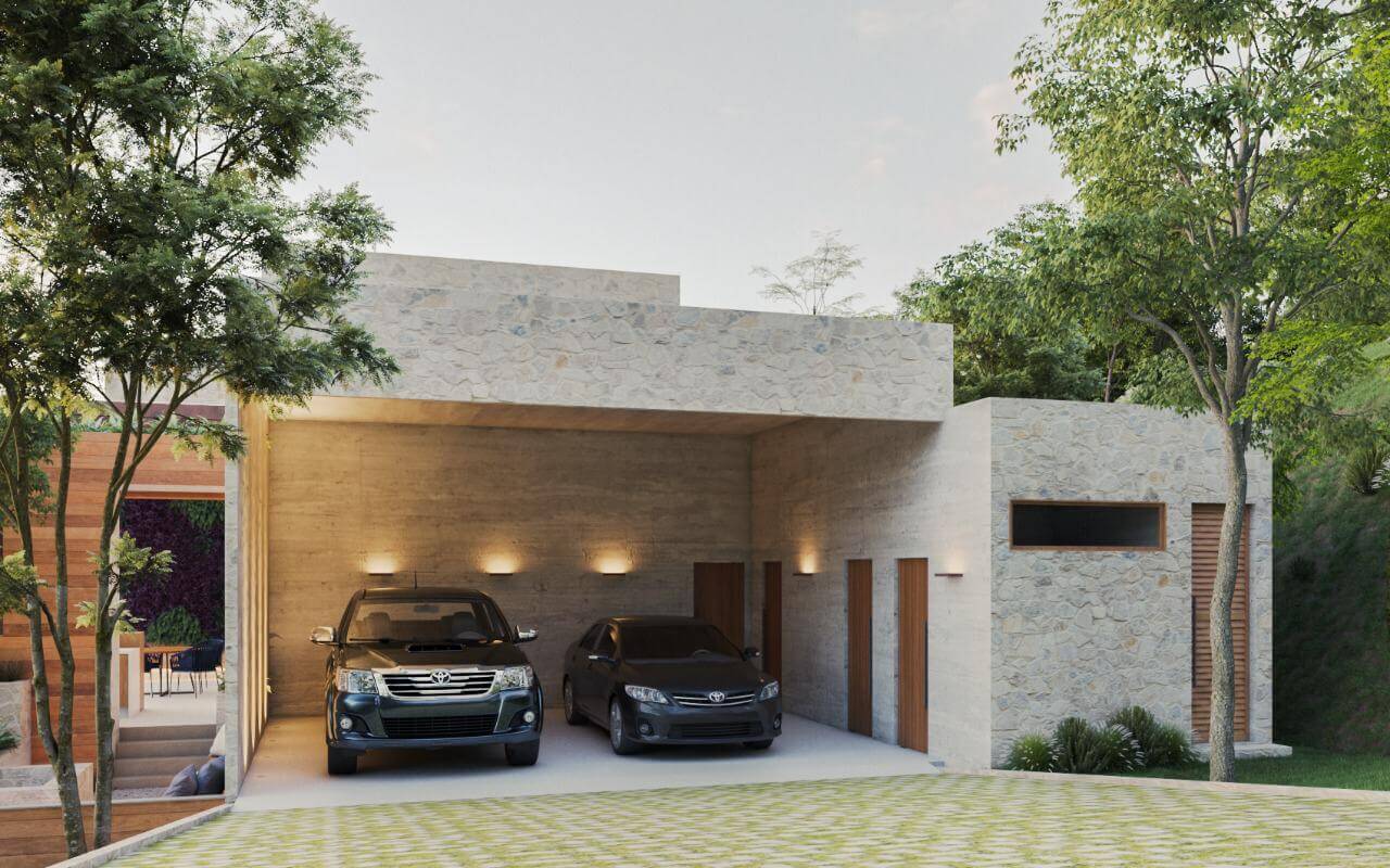 A QUINTA 55 teve seu projeto arquitetônico criado pelos arquitetos Junior Torezani e Victor Sarcinelli do Studio TSAE. Conceituada pela força e robustez dos materiais empregados em contraponto com a beleza do plano de fundo da floresta do Condomínio Espelho d’Água, a casa é marcada pelas esbeltes de suas lajes e marquises em concreto aparente, unindo-se as elevações envidraçadas, que promovem maior iluminação e ventilação natural. A pureza e simplicidade das formas retilíneas cria leveza com os beirais angulados suavizando a inserção da casa na paisagem, que é implantada no nível mais alto do terreno, trazendo maior imponência e destaque com suas largas proporções e espaços generosos, característica singular do projeto. Os limites entre interno e externo são quebrados com a liberdade visual dos cheios e vazios promovidos pelas extensas esquadrias e seus brises verticais, assim como os volumes arquitetônicos que enaltecem as luzes e sombras do interior minimalista e único.