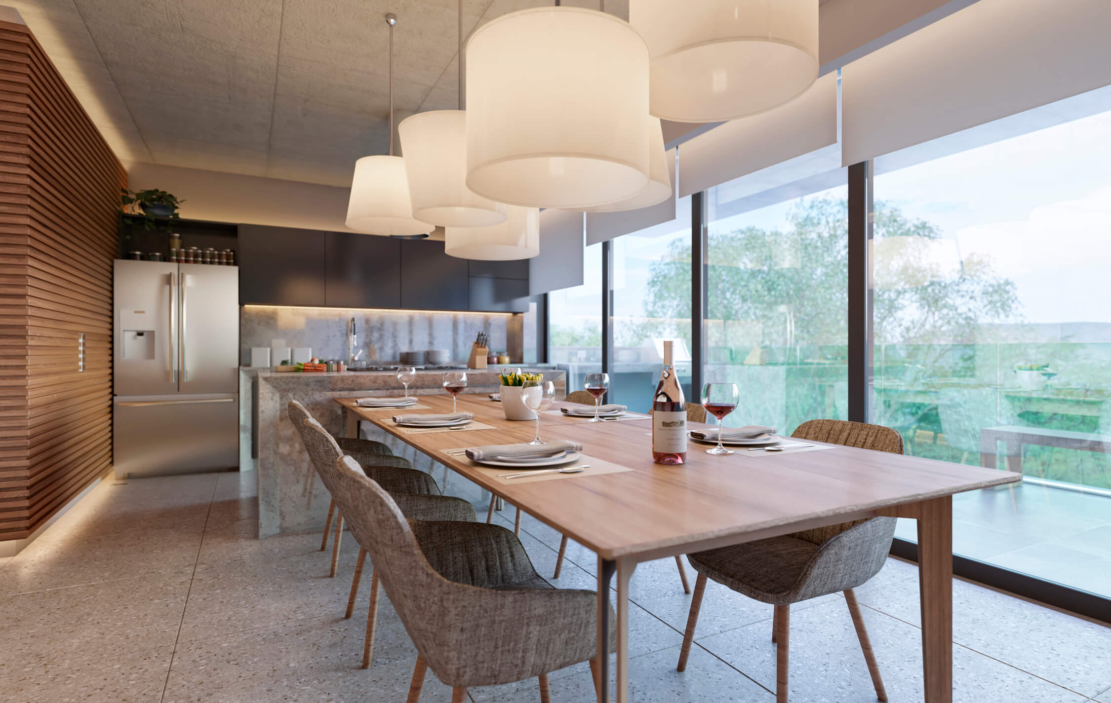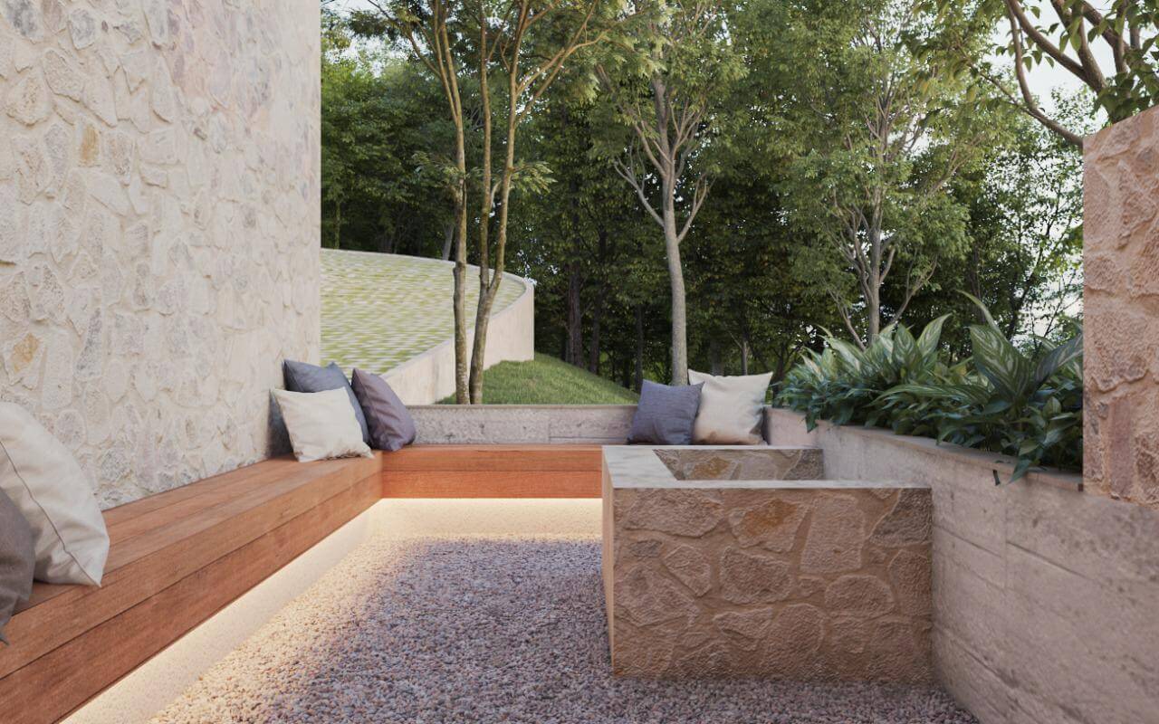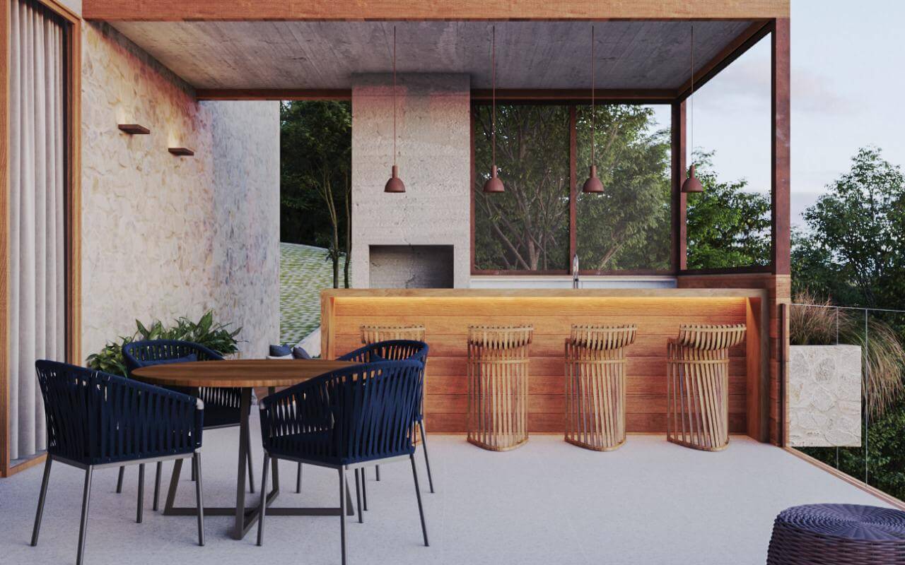 "Para projetar esta casa, criamos um perfil imaginário de uma família que goste de desfrutar de momentos especiais na companhia dos amigos e parentes." A arquiteta se propôs a desenvolver um layout versátil capaz de atender as mais variadas demandas familiares. Para que o projeto seja único, ele traz também uma série de diferenciais como a bombfire, o ateliê para hobbies diversos, uma sala de degustação e adega. São ambientes que proporcionarão um convívio especial e prometem surpreender aos mais exigentes perfis de clientes. A escolha dos materiais priorizou as texturas terrosas, neutras e a pedra natural, de modo a estimular a tatilidade e reforçar o desejo de permanência. A iluminação natural foi uma das grandes aliadas, banhando todos os ambientes e proporcionando o aconchego tão desejado em locais onde as temperaturas são mais baixas. Além disso, a inserção de jardins internos reforça a sensação de pertencimento e bem-estar que a natureza proporciona.